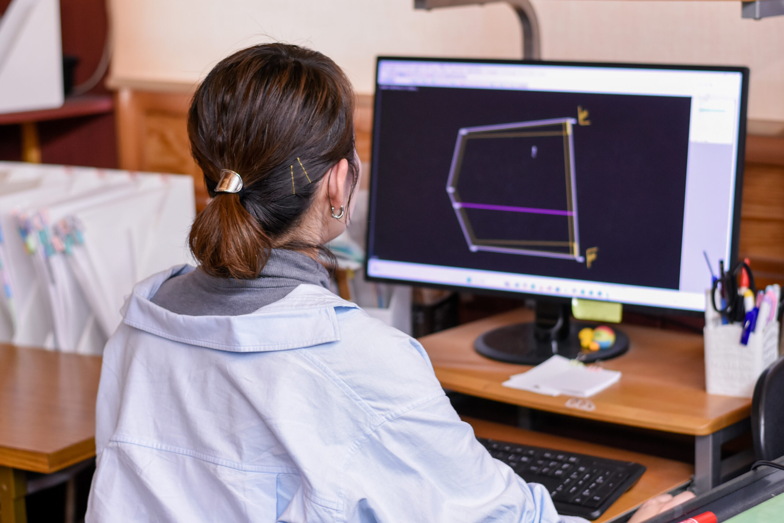 技術を教えてくださる会社の専任のスタッフの元に学びに行き、必要な技術をゼロから習得しました。私の仕事は主に「グレーディング」と言って、標準寸法の型紙(パターン)をもとに、必要に応じた大小のサイズの型紙を作ることです。各サイズにあったシルエットやデザインにすることに重きが置かれています。上司に「未経験からでも大丈夫」と言ってもらったので「私にもできるかな」と思い挑戦してみましたが、いざ、やってみたら結構難しくて(笑)。日々、実践を積み重ねることで経験を深め、自分の感覚の引き出しを増やすよう心がけています。業務上、難しいと感じるのは、パターンを作る際にすべて数値で判断しきれないところ。例えばウエストや膝丈の寸法は数値を出して処理しやすいのですが、股上の場合は、股からウエストまでの長さが浅いほど、洋服のシルエットにカーブがかかりやすくなります。そこを感覚的に解釈できる目を養えるかが肝になってきます。パソコンで単純に数値を打ち込んだだけでは、実際に縫えない形にサイズ展開されてしまうこともあるので。そうしたことを回避するために、パソコン上で数式を作る緻密な作業をしています。