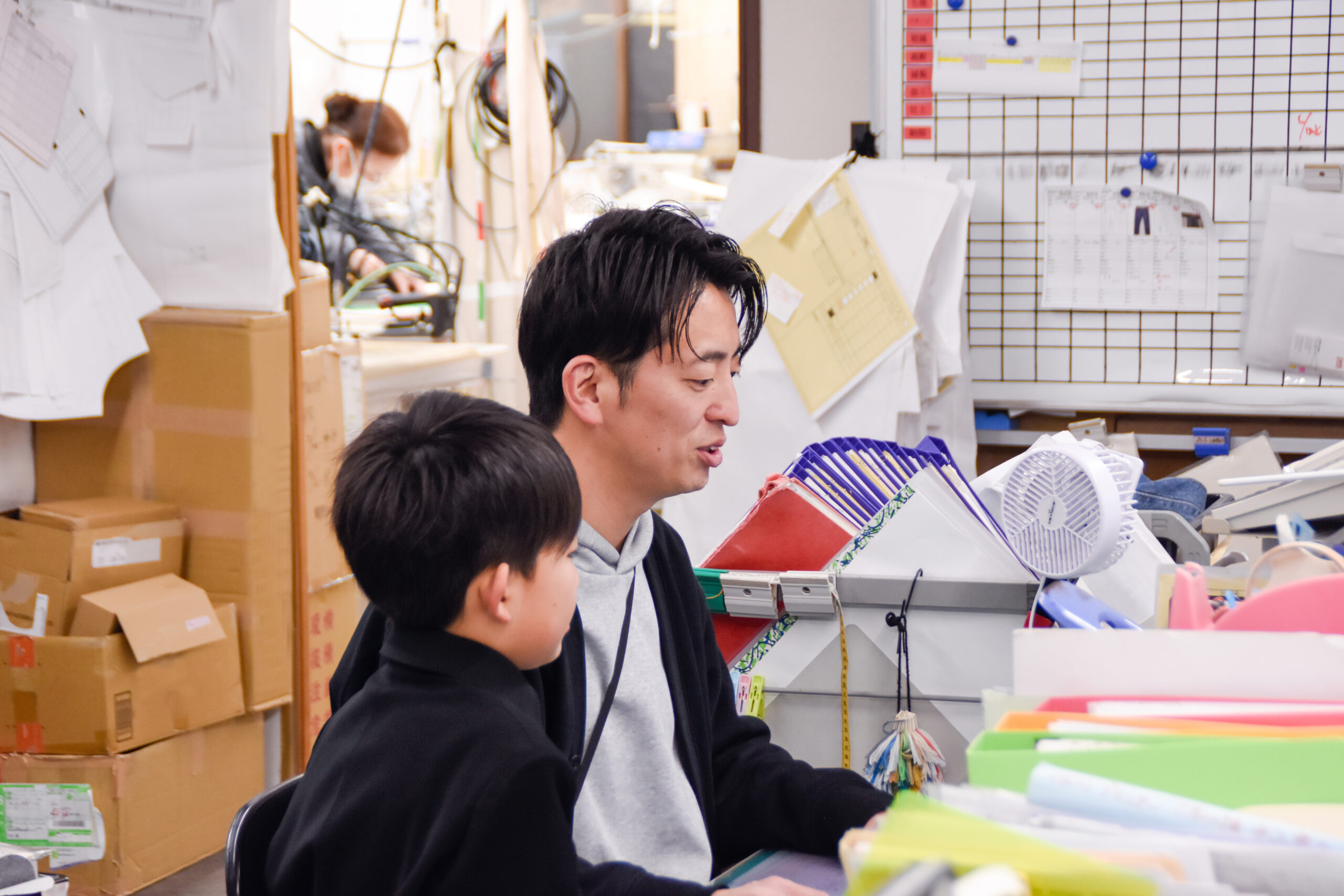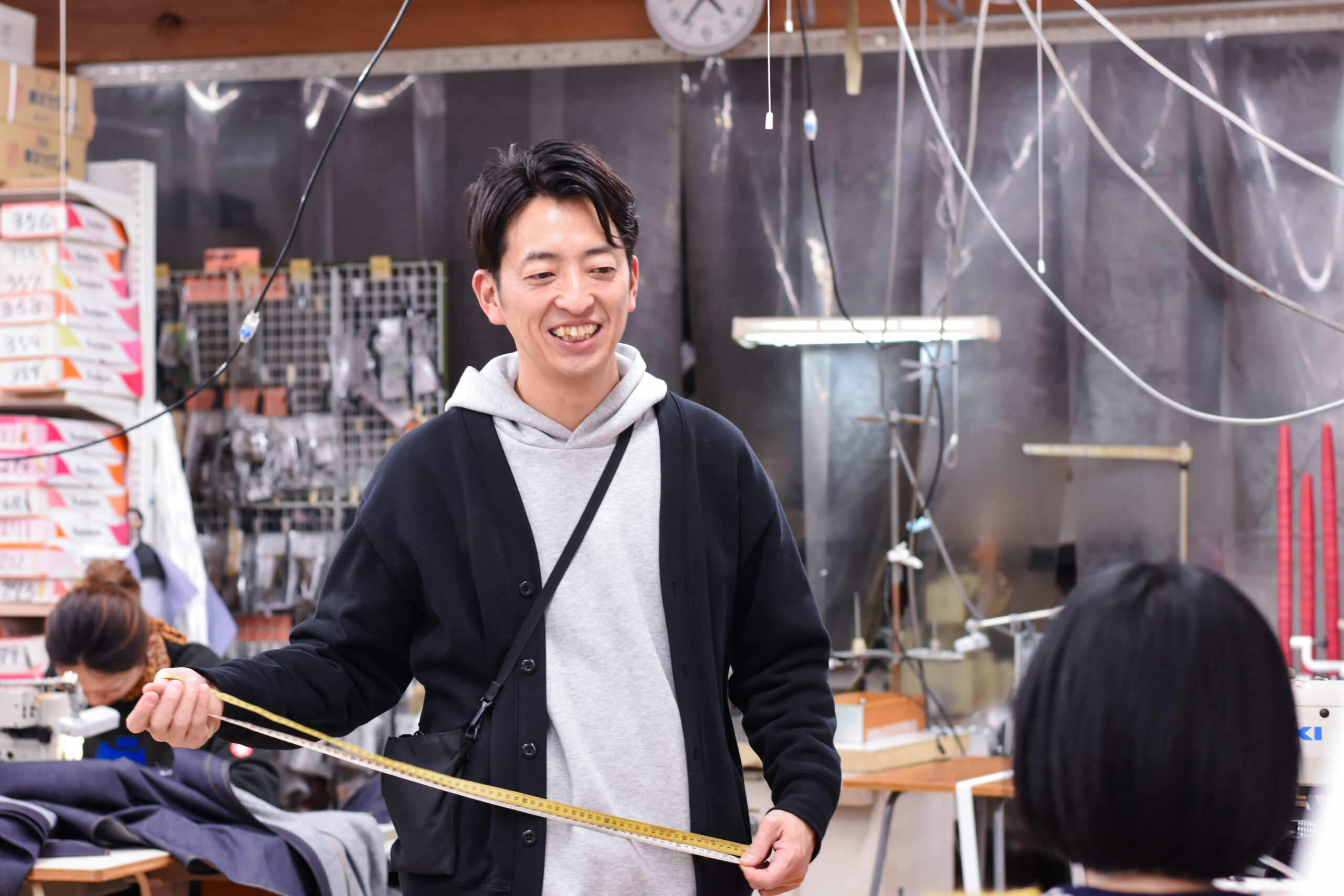 樋之津:私は東京のOEMアパレル企業で生産管理の仕事をしていました。あるとき、もう少し家族に会える環境で仕事をしたいと思い立ち、地元・岡山で仕事を探したのがきっかけです。もともと生産管理の仕事は、地元に帰っても続けられるかもしれない、と長期的な視点で選びました。国内外の多様なブランドの生産を行なっている会社ということに可能性を感じました。これまでに自分がやってきた経験を活かせそう、と思い入社しましたが活かせることは採寸くらいで(笑)。ウチの会社は工場が併設しているため、想像していたよりももっと現場に近い仕事が多いのが特徴で、そこがO E Mアパレル企業との大きな違いです。新たなチャレンジが多く、とても勉強になっています。